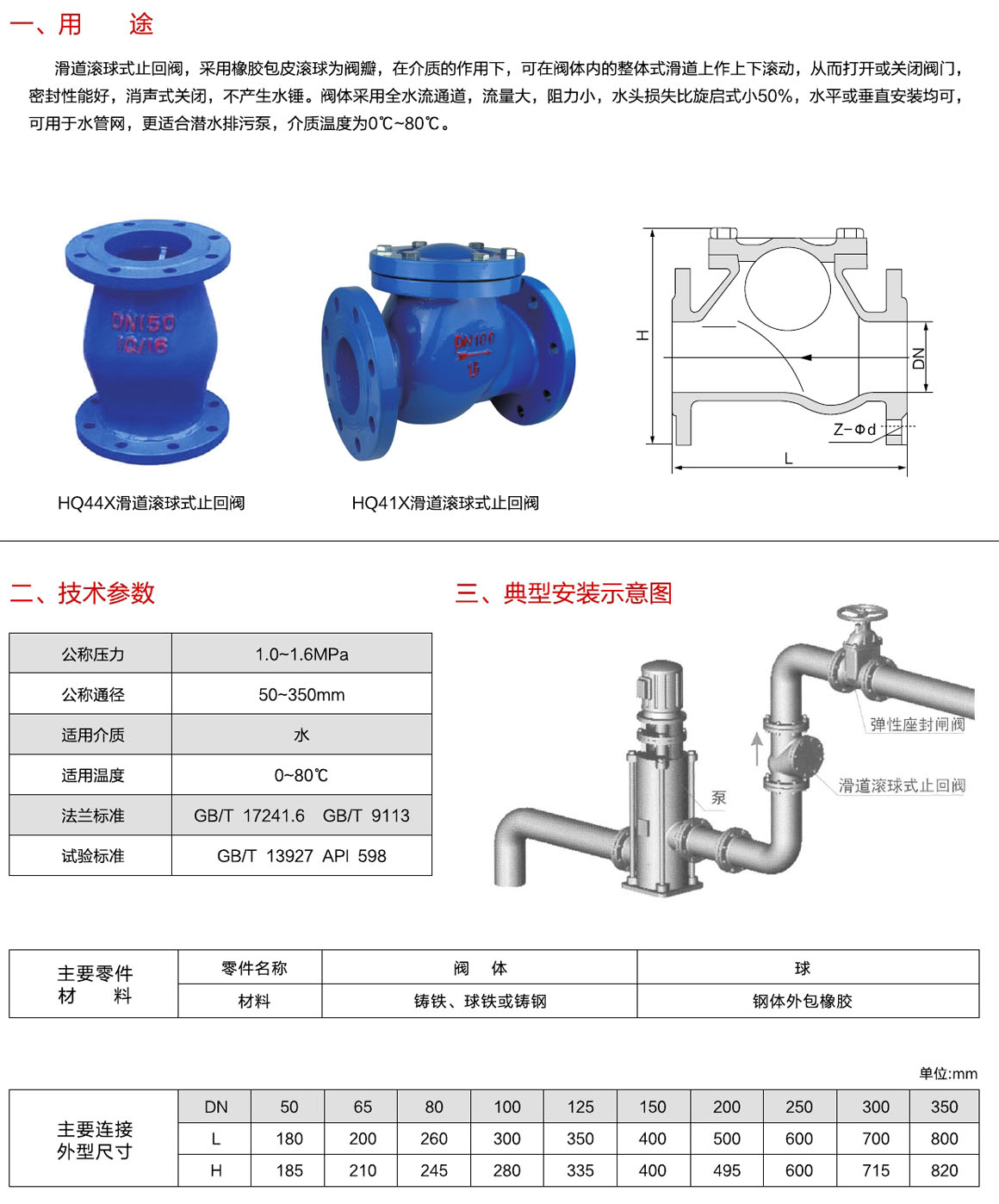 滑道滾球式止回閥,采用橡膠包皮滾球?yàn)殚y瓣,在介質(zhì)的作用下,可在閥體內(nèi)的整體式滑道上作上下滾動,從而打開或半閉閥門,密封性能好,消聲式關(guān)閉,不產(chǎn)生水錘。