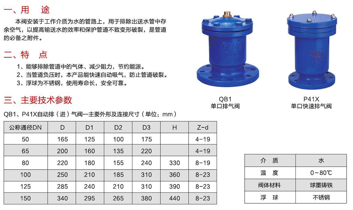 本閥安裝于工作介質(zhì)為水的管路上,用于排除出送水管中存余空氣,以提高輸送水的效率和保護(hù)管道不致變形破裂,是管道的必備之附件。