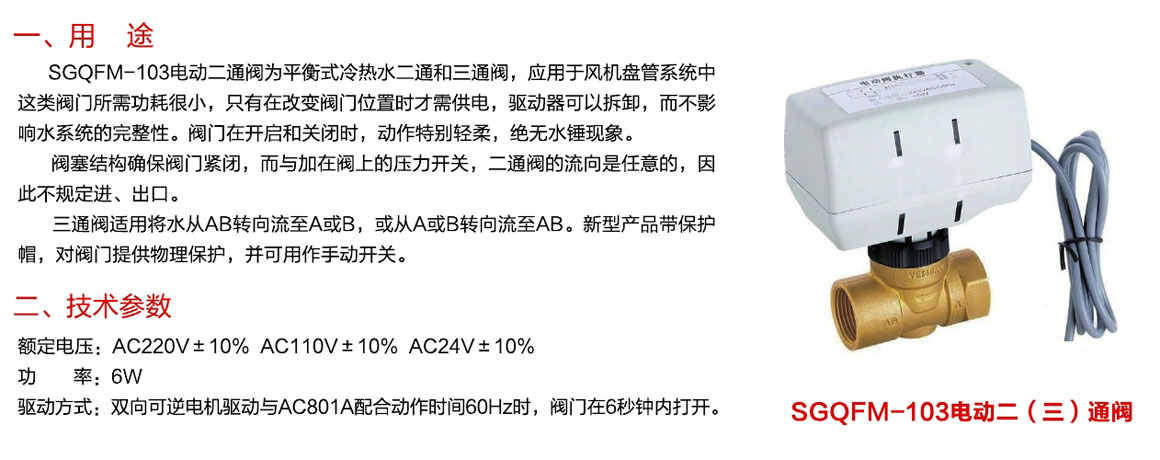 SGQFM-101電動(dòng)二通閥用于控制風(fēng)機(jī)盤管水管道的開啟、關(guān)閉,達(dá)到控制室溫之目地。